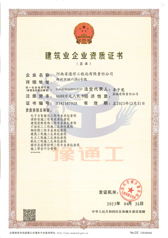 電子與智能化、建筑裝修裝飾、消防設(shè)施工程專業(yè)承包壹級;鋼結(jié)構(gòu)工程專業(yè)承包貳級;建筑工程、電力工程、機電工程、城市及道路照明工程專業(yè)施工總承包叁級;施工勞務(wù)不分等級。